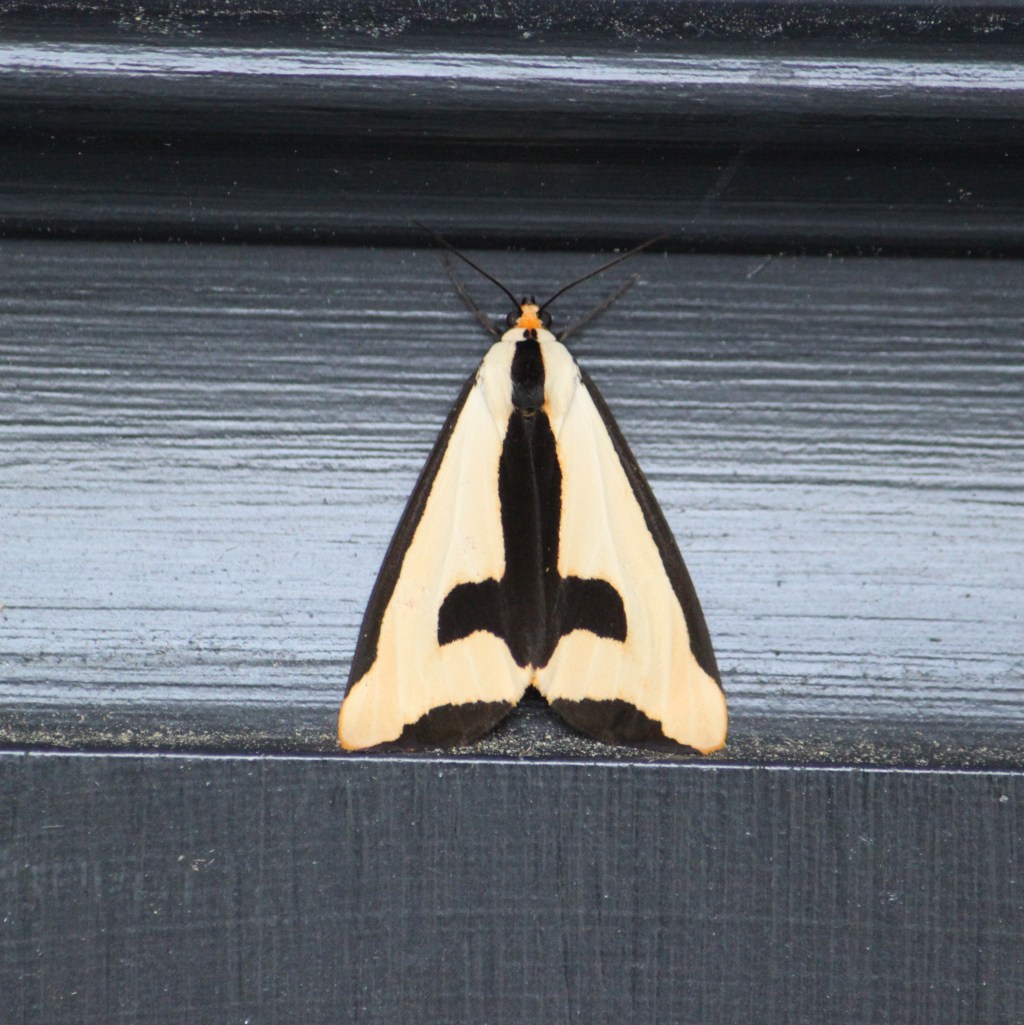 Last week more inspiration appeared in the form of a new moth – this one tan and black with the appearance of a mask on its wings. Think “Gilligan’s Island” and totems and you’re getting close.