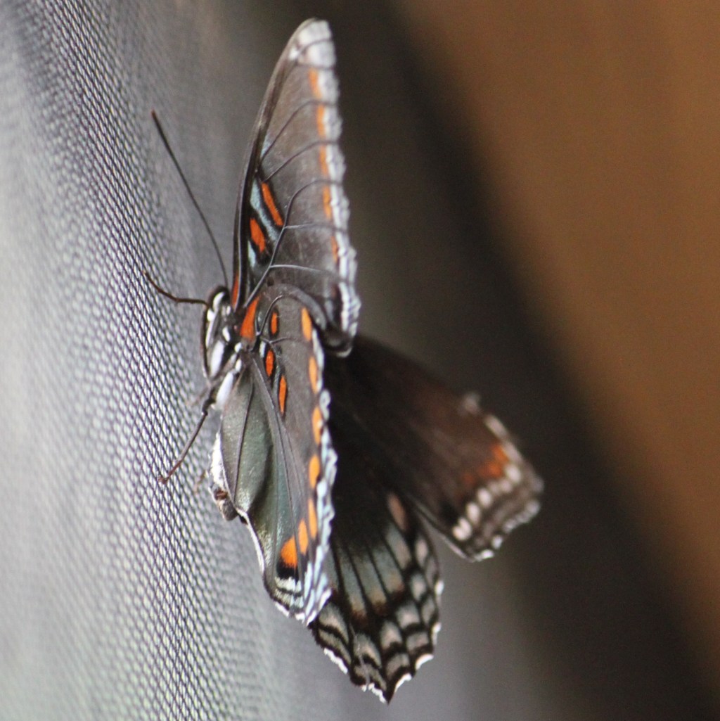 Also that week my house guest in town for the funeral sat on my front porch taking in the view. I walked outside just as a black and blue butterfly made herself known. Like the in-town grandkid, my friend waved it away. The butterfly only became more daring, flitting in her face.